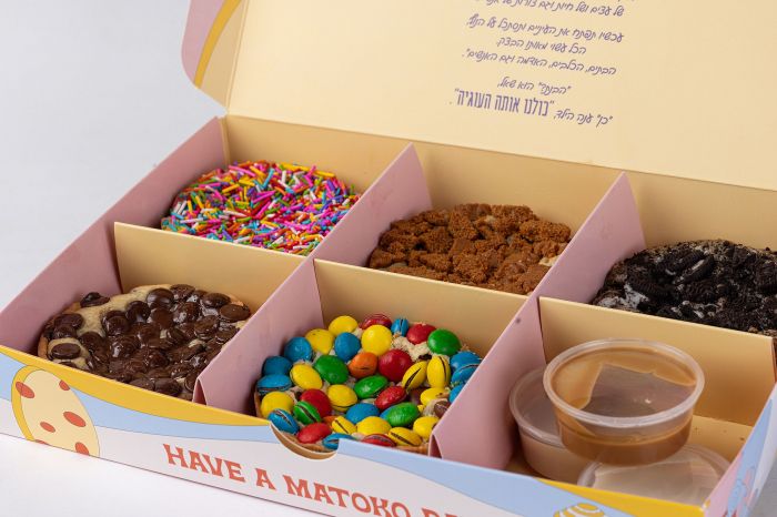 מארז המכיל 5 עוגיות טבעוניות: אוראו, לוטוס מריר, לוטוס לבן, ים תיכונית, מריר מלח גס + 3 דיפים.